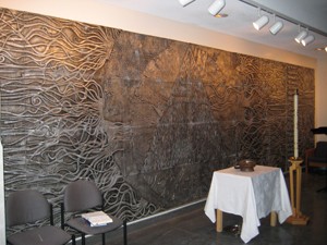 The metal artwork executed for Queen’s College by Jordi Bonet is an eloquent proof that a modern composition, essentially abstract, can nevertheless carry a theme easily recognizable: Faith, Hope, Charity.